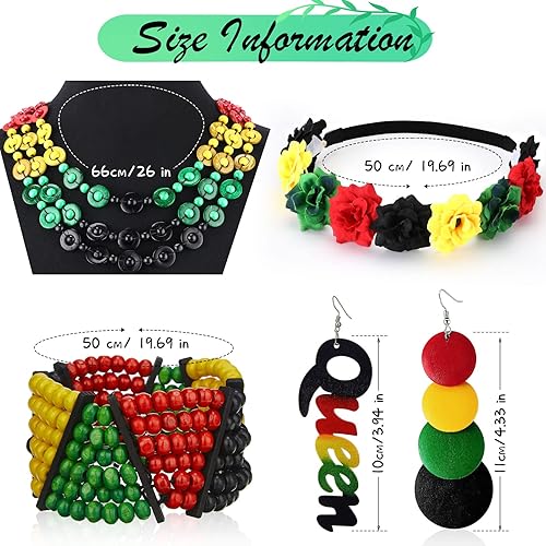 - Jamaican Jewelry Set: you will receive 1 piece of African bracelet, 1 piece of beaded necklace, 2 pairs of Rasta earrings, and 1 piece of flower headband, the combination contains black, green, yellow, and red colors, wearing them will add an ethnic touch to your look